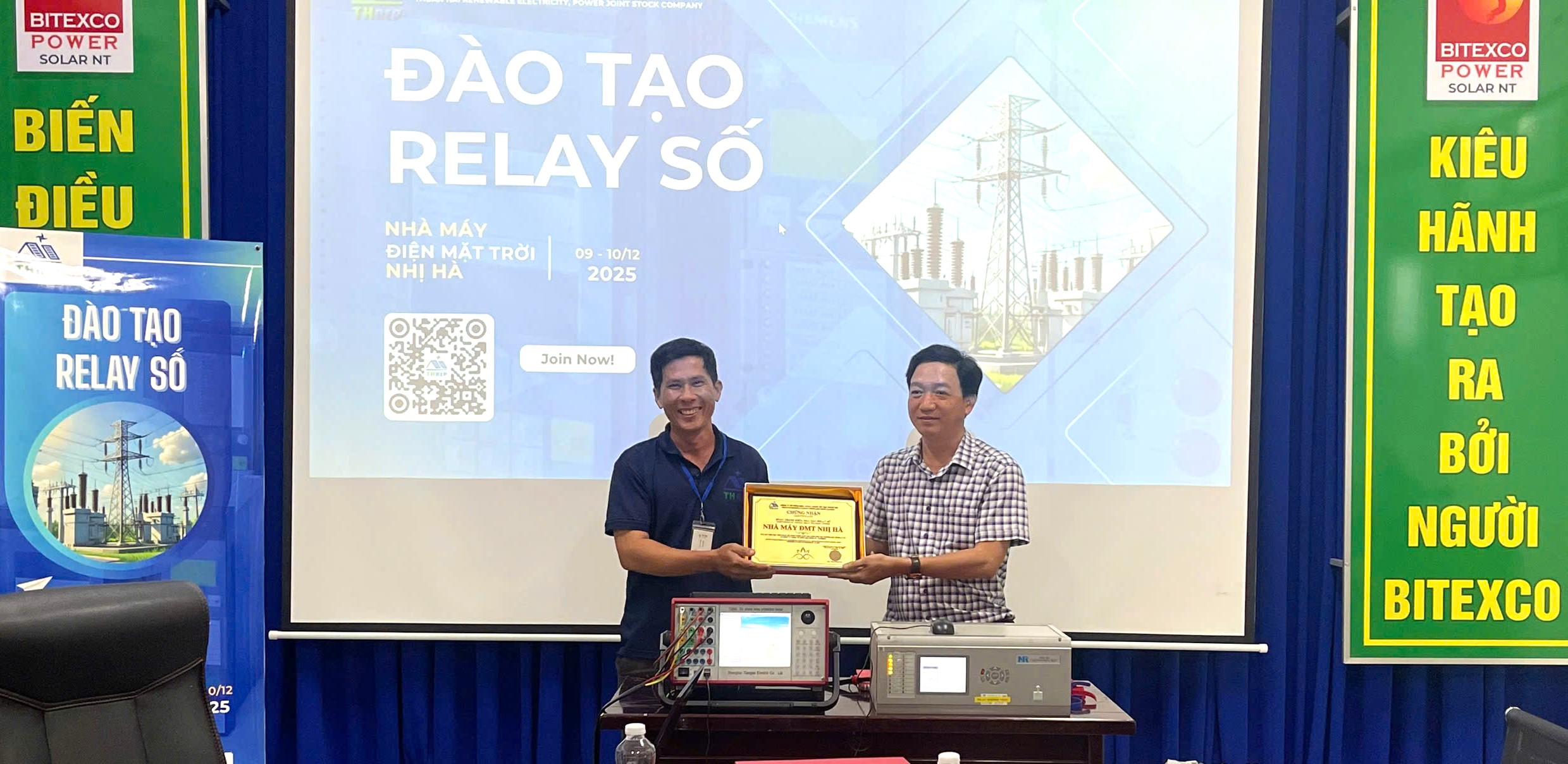 Ông Nguyễn Công Thành – Giám đốc Nhà máy điện mặt trời Nhị Hà (bên phải) nhận giấy chứng nhận đào tạo relay số.