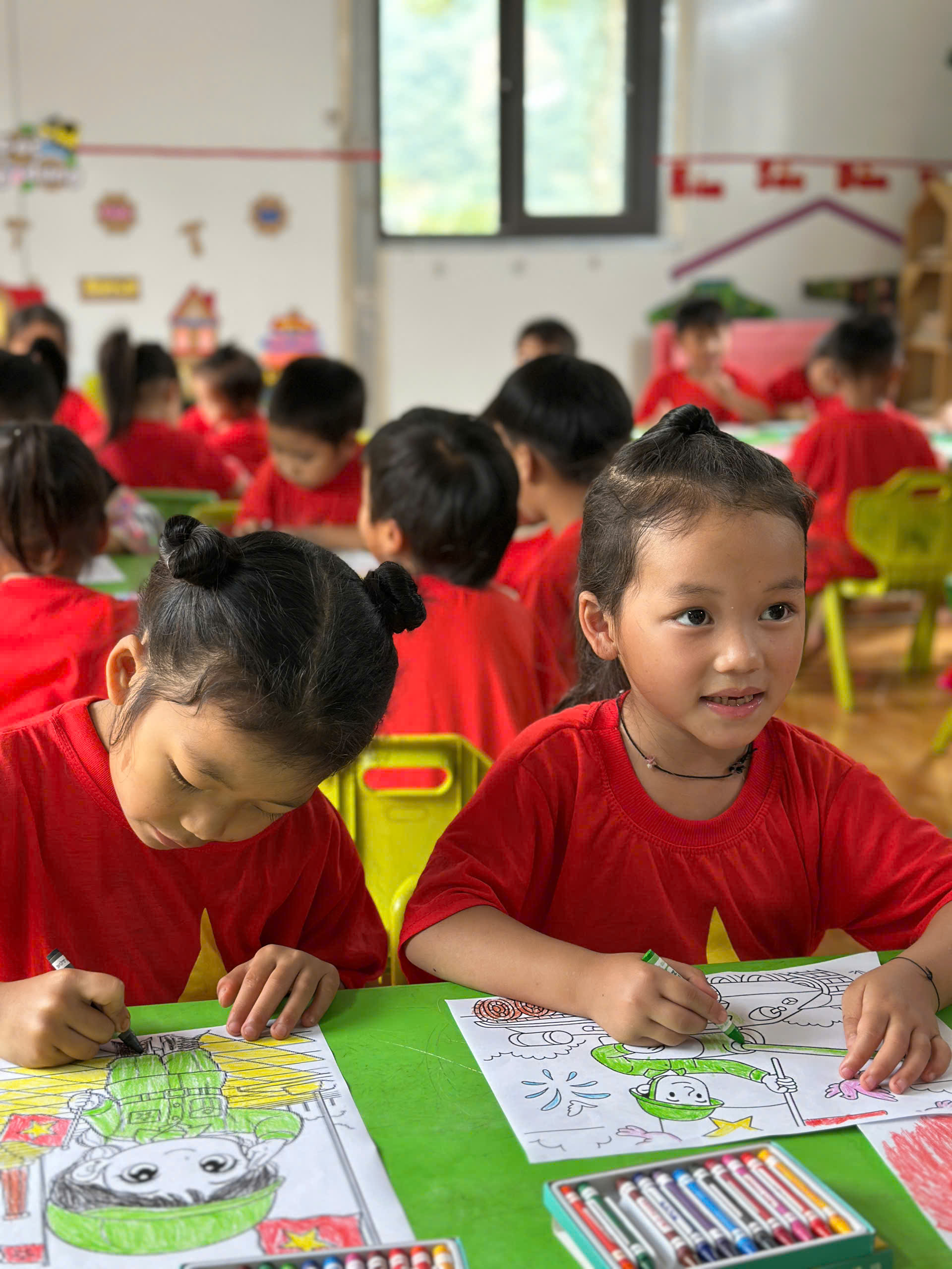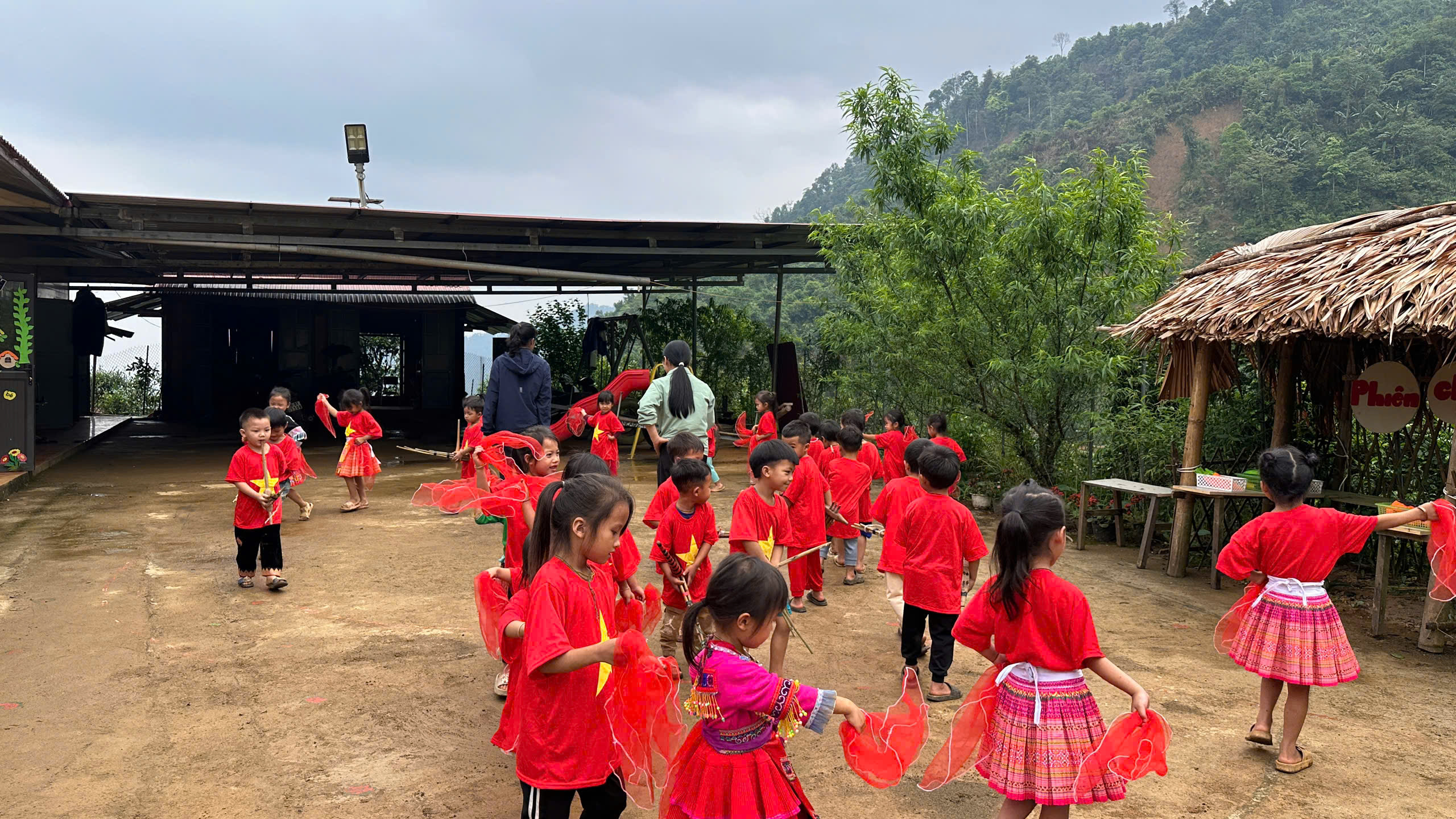 Trước đó, cô và trò ở điểm trường mầm non Làng Mảnh cùng nhau tập luyện văn nghệ, chuẩn bị mừng Lễ khánh thành.
