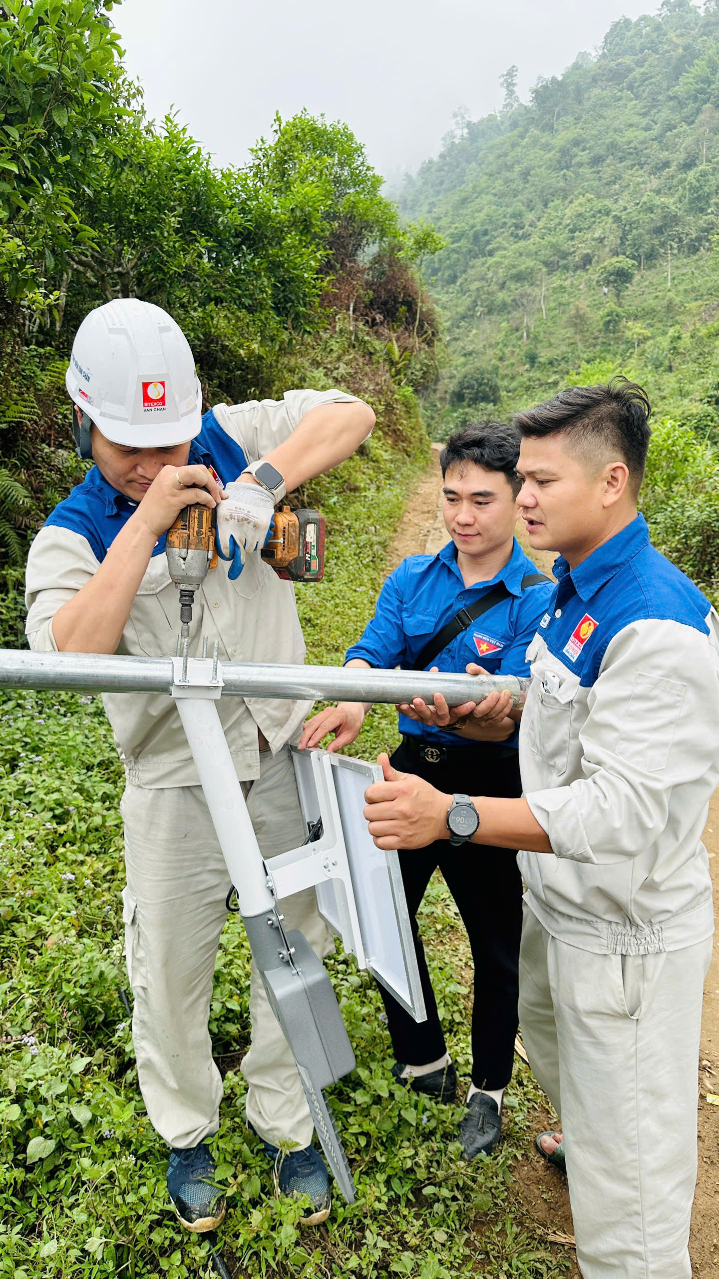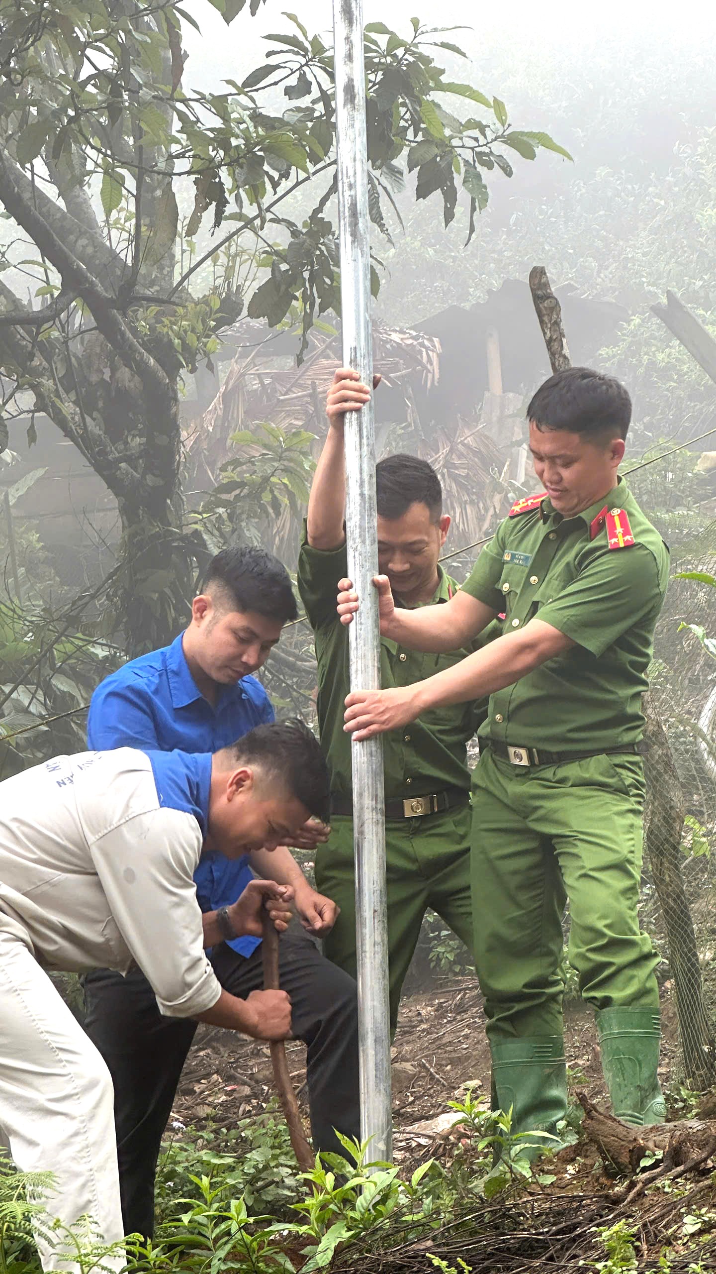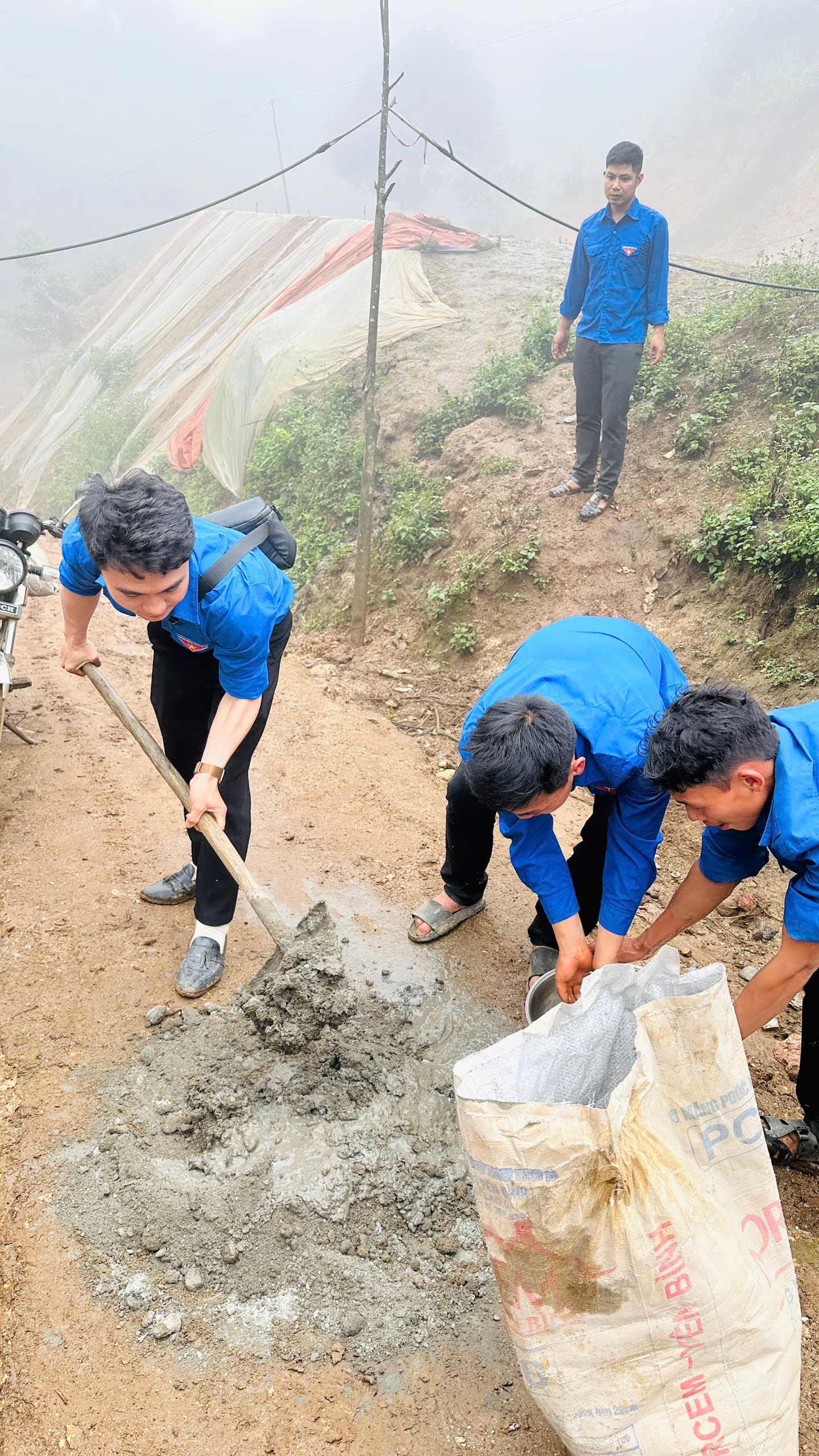Mỗi người một việc, người lắp đèn, người trộn vữa… để kịp tiến độ hoàn thành công trình. Trong làn sương mờ ảo, màu áo xanh như bừng lên sức sống và nhiệt huyết tuổi trẻ giữa núi rừng Tây Bắc.