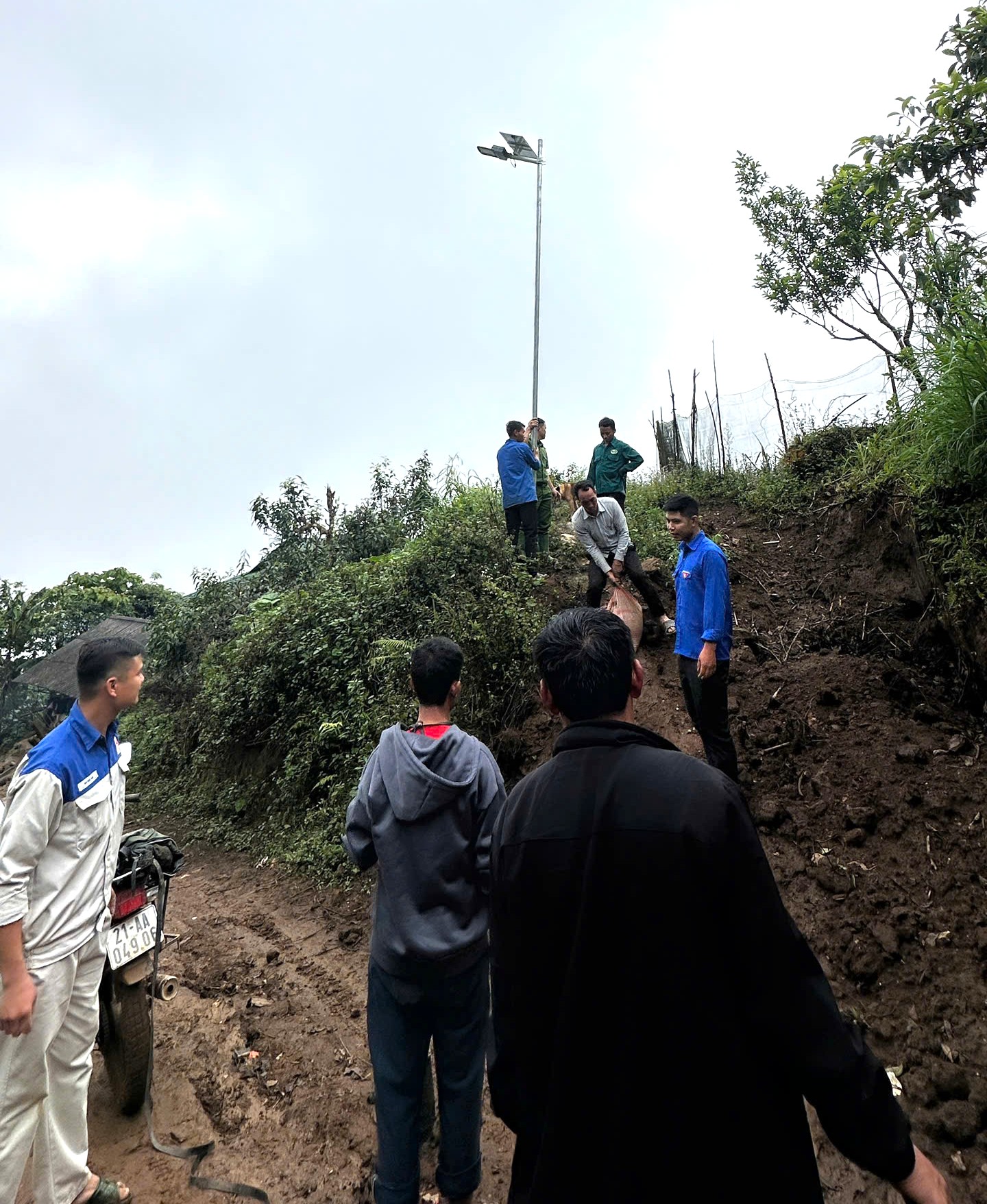 Sáng 23/4 vừa qua, khi sương núi còn bao phủ khắp triền núi cao, bà con thôn Làng Mảnh đã háo hức tập trung về những con đường quanh thôn để cùng dựng lên những chiếc cột đèn năng lượng mặt trời.