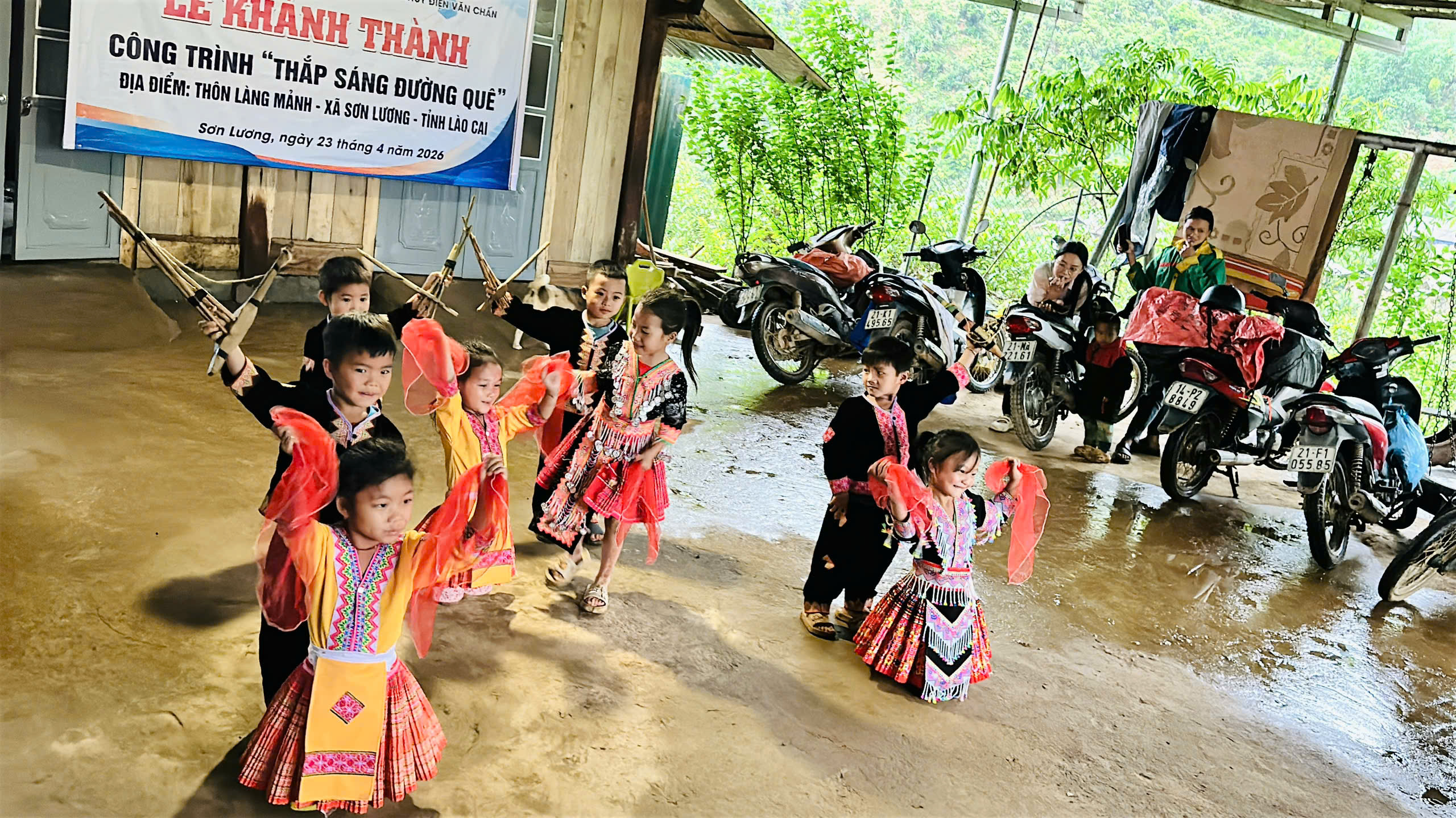 Các em nhỏ biểu diễn văn nghệ mừng công trình thanh niên thành công.