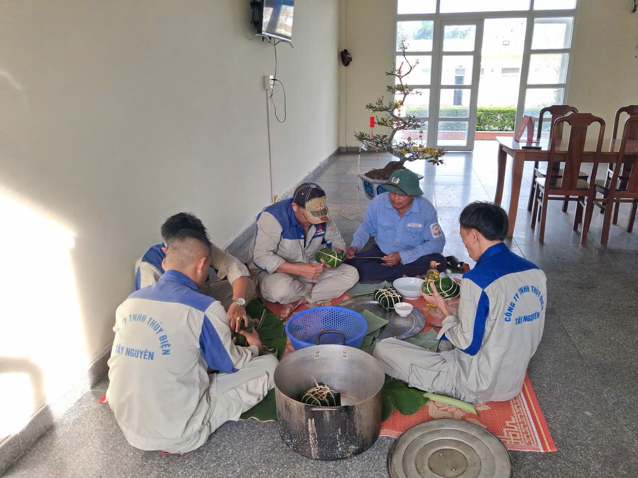 Những ngày cuối tháng Chạp năm Ất Tỵ, mấy anh em cụm nhà máy thủy điện Đăk Srông 2 và 2A (thuộc Công ty TNHH Thủy điện Tây Nguyên, tỉnh Gia Lai) trải chiếu ra nhà ăn, sắp rổ gạo nếp, cuộn lá dong… rồi ngồi xếp bằng gói bánh chưng, bánh tét ăn Tết con ngựa.