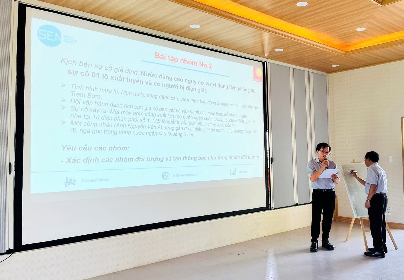 Dưới sự hướng dẫn của chuyên gia, các đội nhóm đã tham gia thảo luận và ứng phó trực tiếp trên các kịch bản giả định bám sát thực tế đơn vị. Các học viên thuộc Ban chỉ huy tình huống khẩn cấp, Đội ứng cứu khẩn cấp, nhân viên vận hành và bảo trì… đã cùng nhau nhập vai, thực hiện các bước trong quy trình ứng phó khẩn cấp của nhà máy. Việc góp ý trực tiếp sau mỗi bài tập giúp các đơn vị nhận ra những lỗ hổng trong kế hoạch hiện tại để kịp thời điều chỉnh và hoàn thiện.