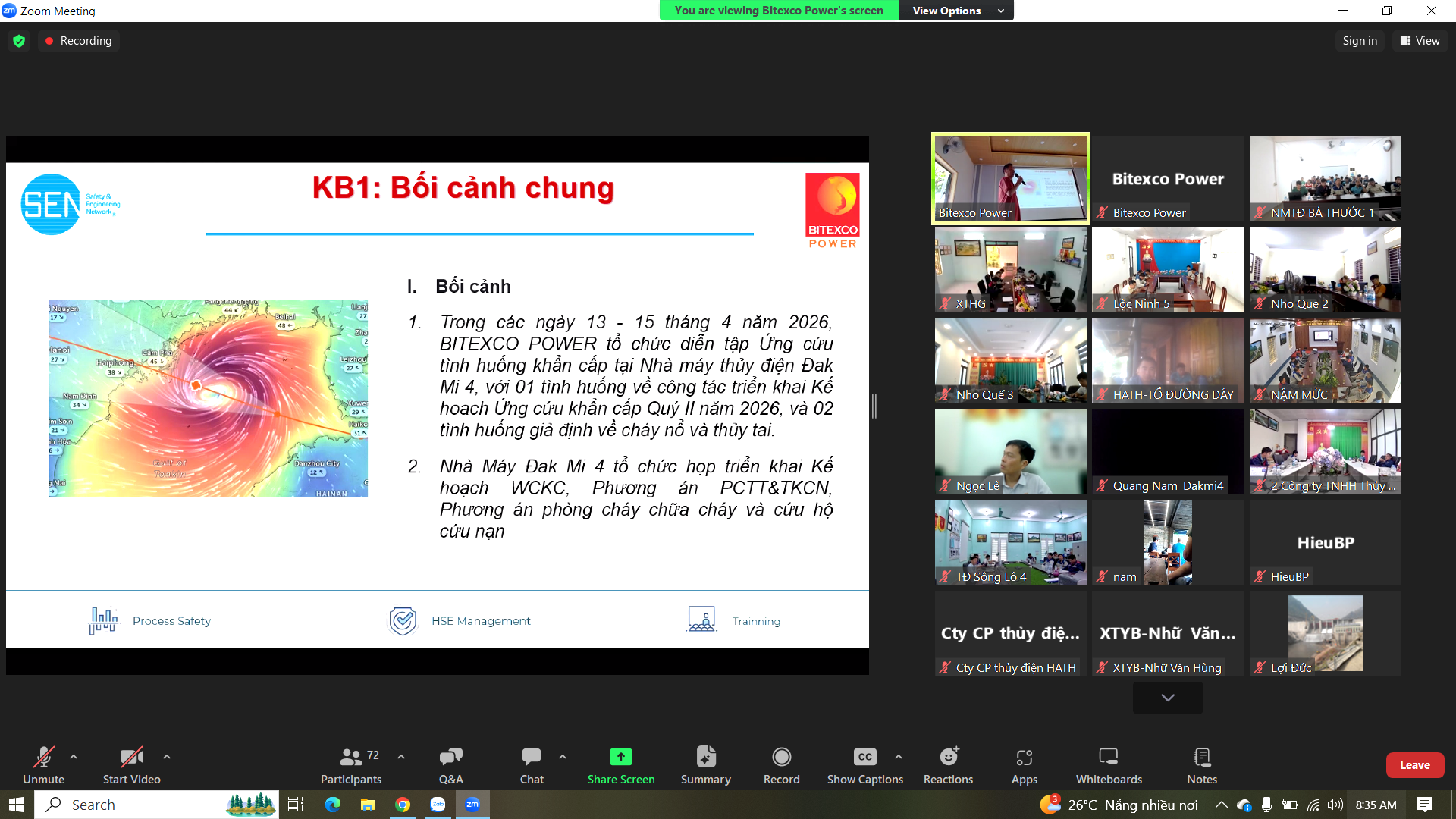 Chương trình do bộ phận Sức khỏe – An toàn – Xã hội – Môi trường (HSSE) Bitexco Power phối hợp cùng đơn vị tư vấn SEN tổ chức tại Công ty CP Thủy điện Đak Mi (TP Đà Nẵng), kết hợp với hình thức trực tuyến. Đây không chỉ là một khóa đào tạo mà là bước kích hoạt năng lực phản xạ hệ thống trước mùa mưa lũ đang cận kề.