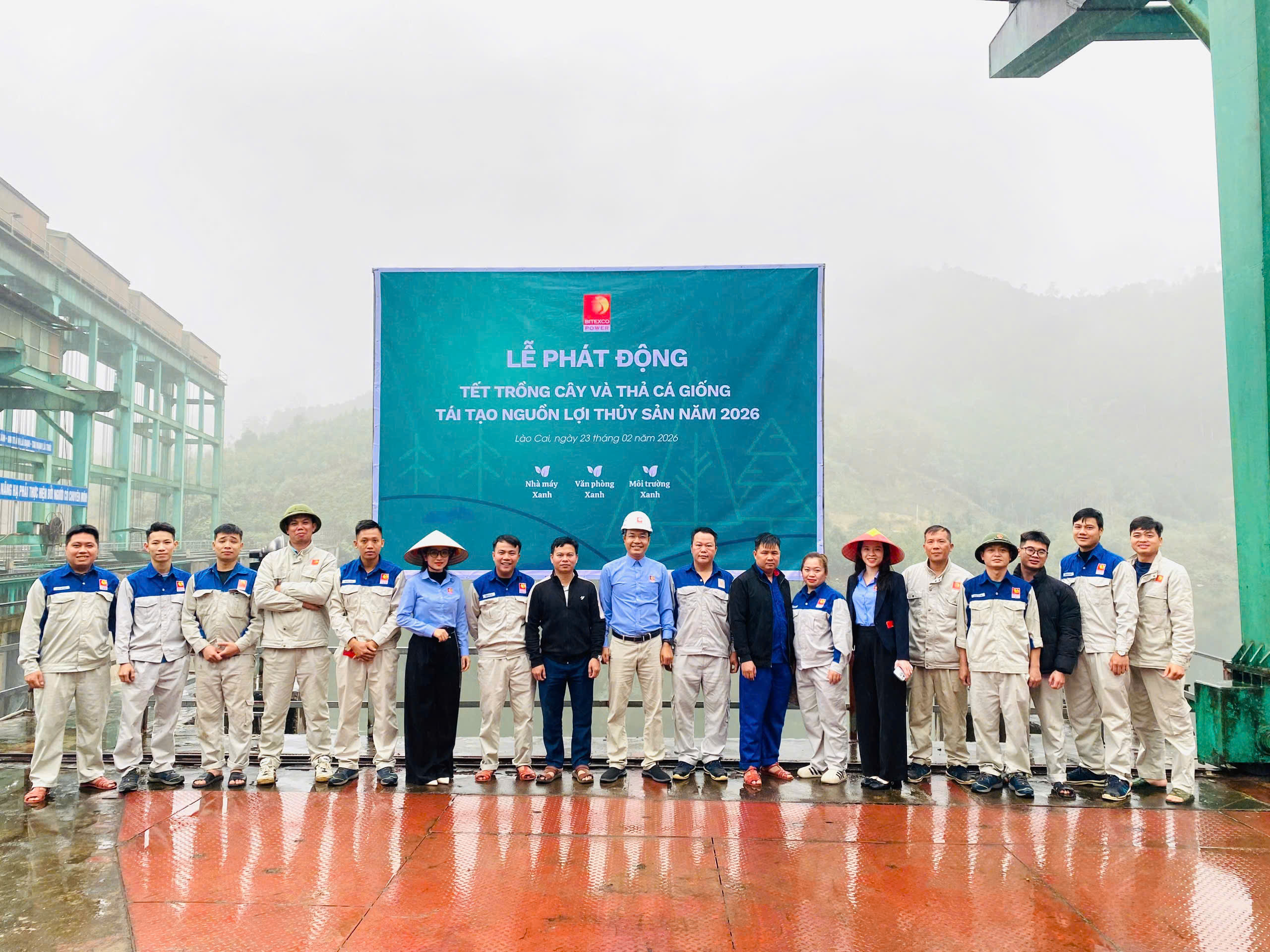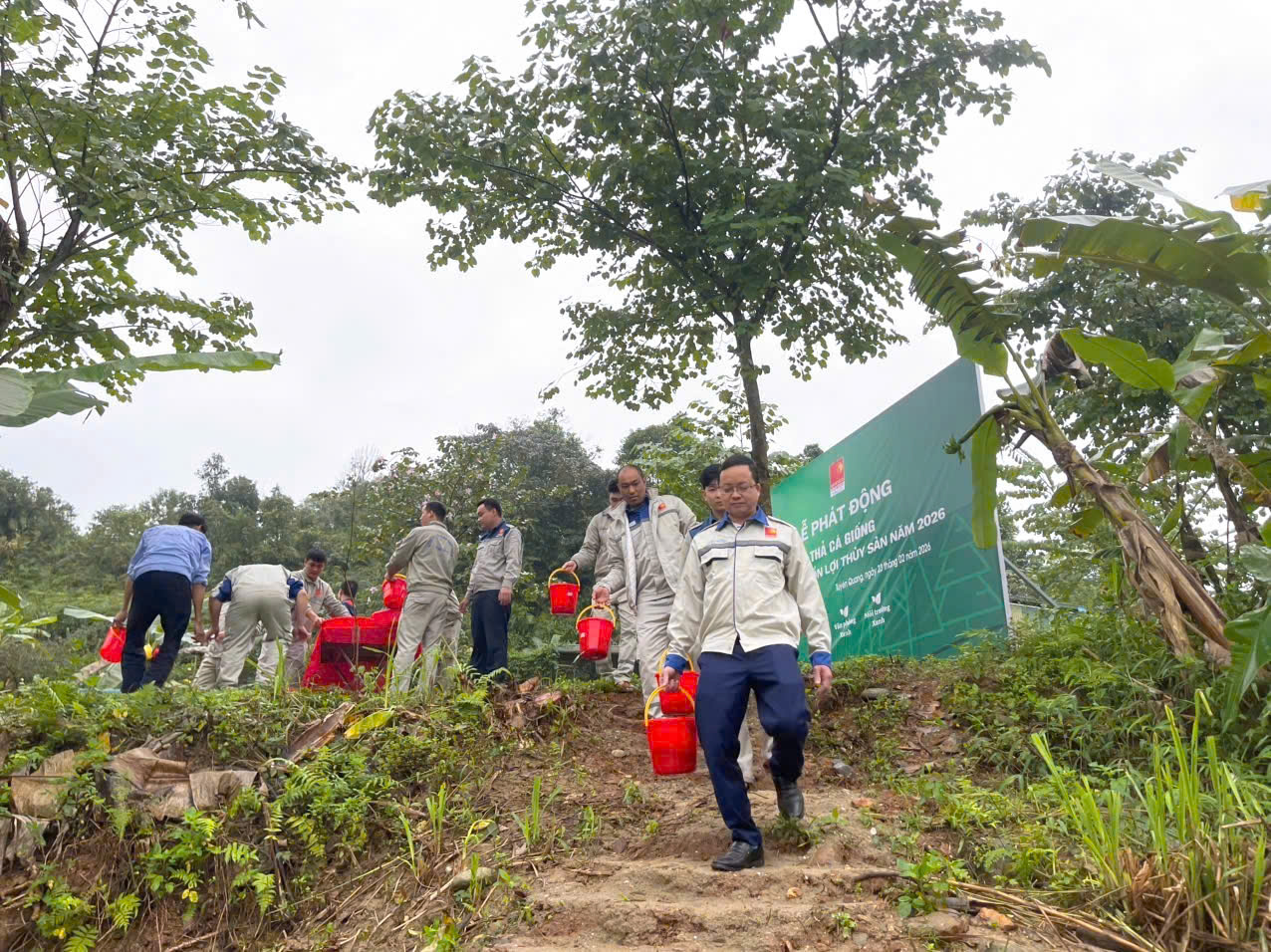 Các anh, chị em Công ty CP Thủy điện Văn Chấn phấn khởi ra quân trồng cây, thả cá giống trong ngày khai Xuân Bính Ngọ 2026.