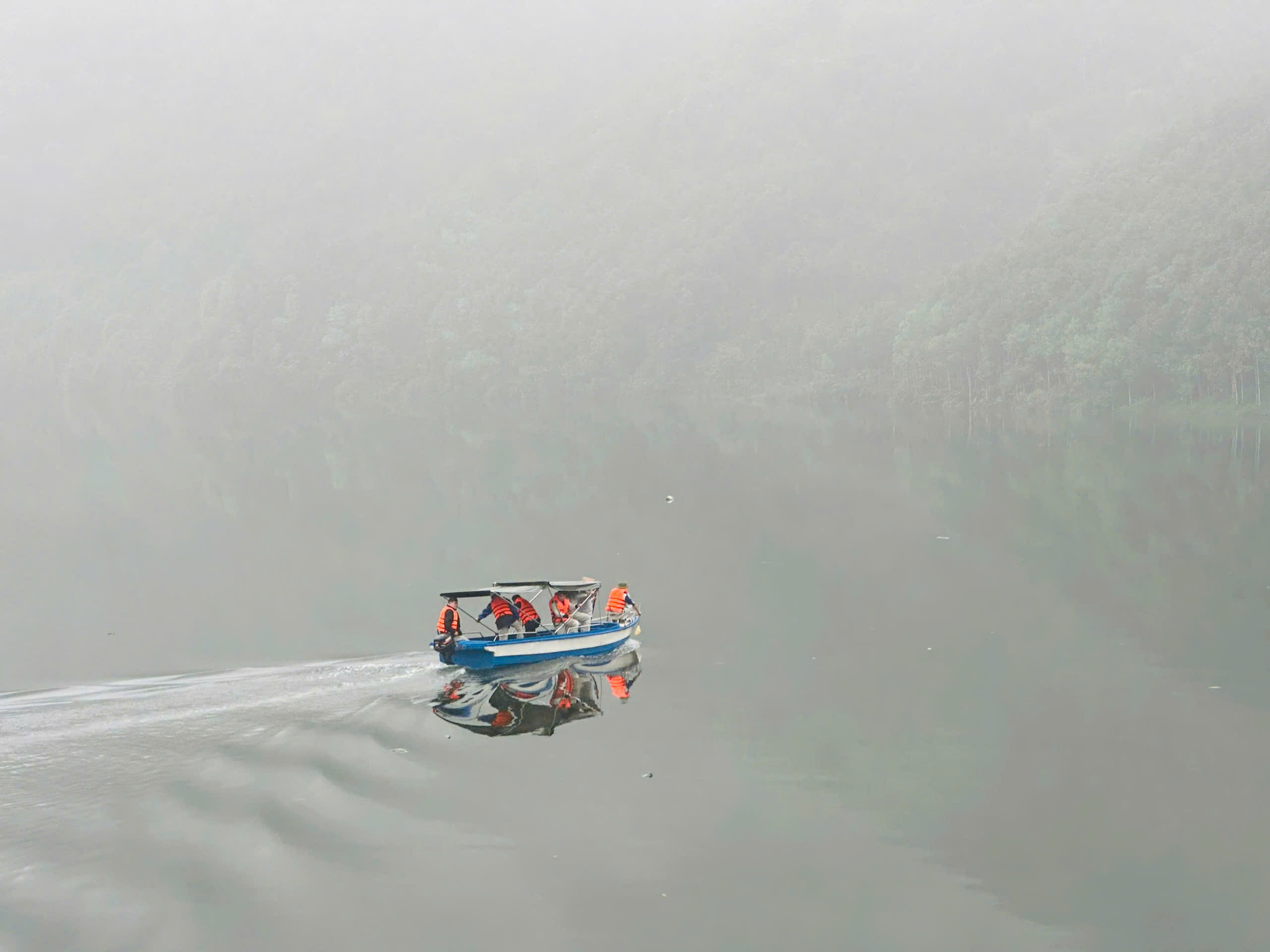 Chiếc thuyền thả cá rẽ nước giữa làn sương mù nơi núi rừng Tây Bắc tạo nên một khoảnh khắc mùa Xuân đẹp và giàu cảm xúc.