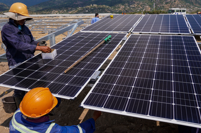 Công nhân lắp đặt tấm pin năng lượng mặt trời tại một dự án ở Ninh Thuận, năm 2020. Ảnh: Quỳnh Trần
