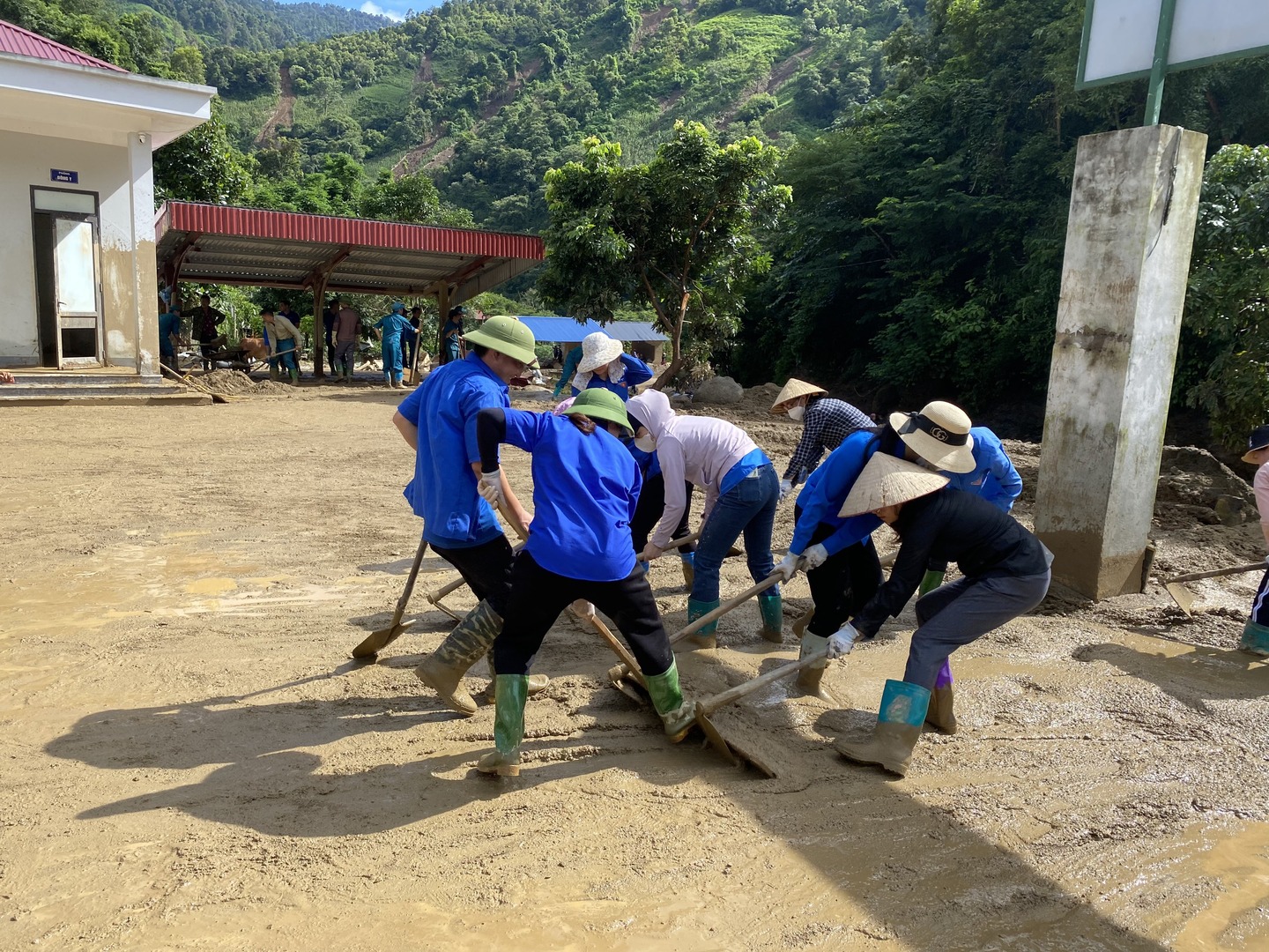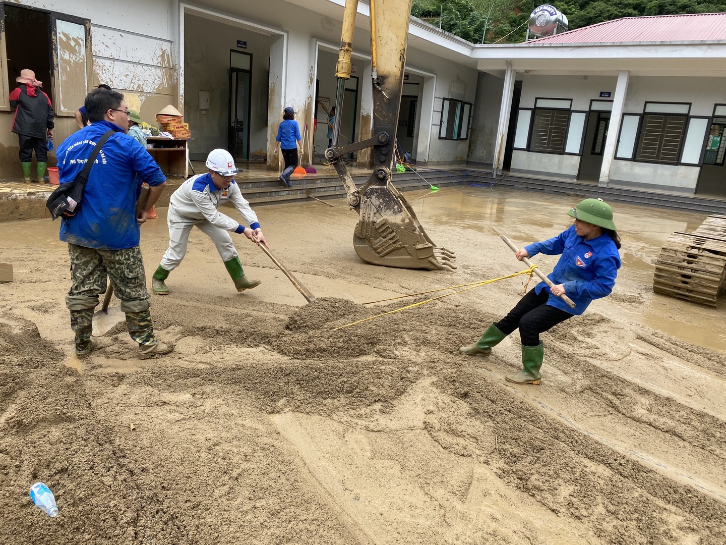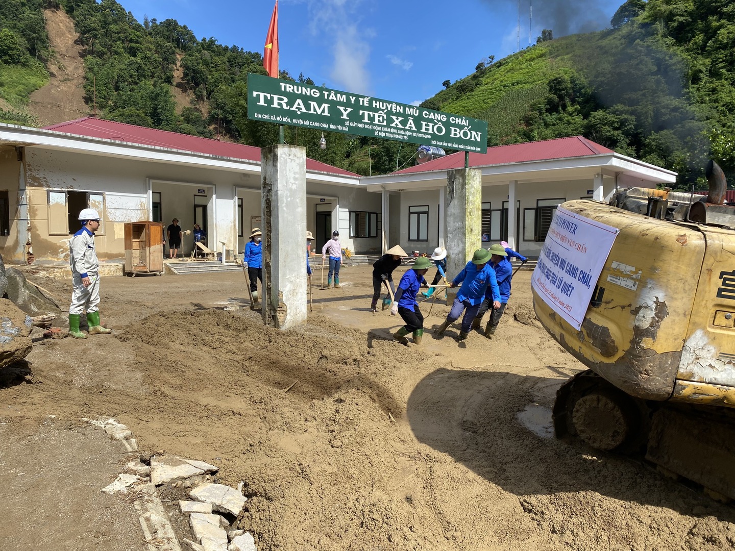 Công nhân thủy điện Văn Chấn cùng nhân dân làm sạch đất, đá ở trạm y tế xã Hồ Bốn.