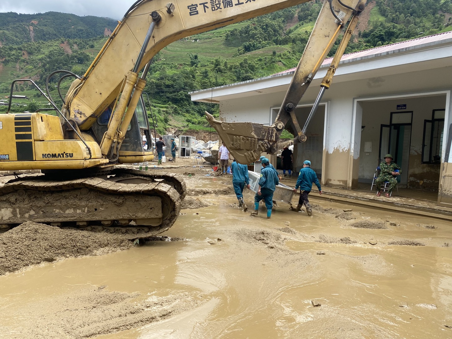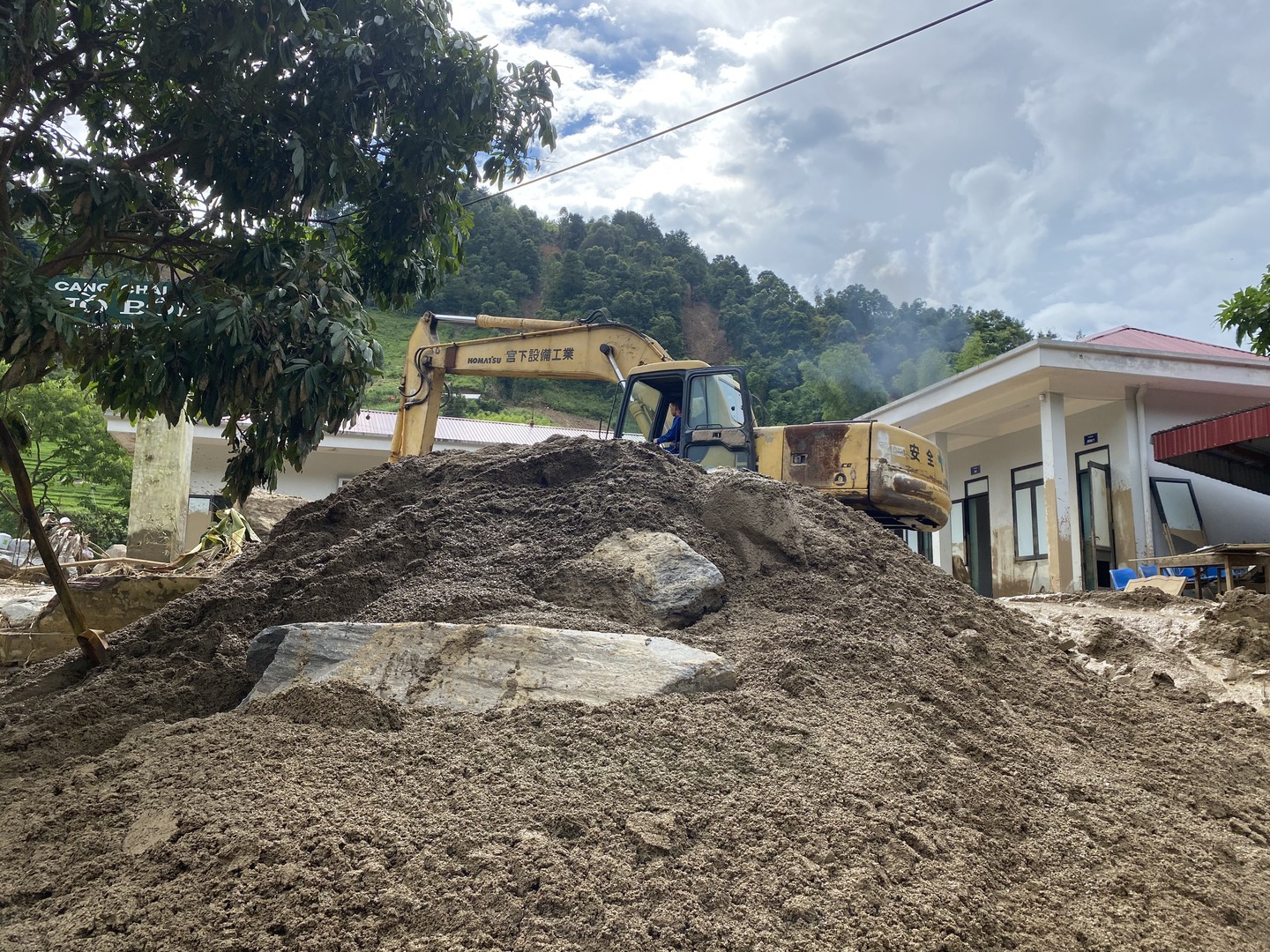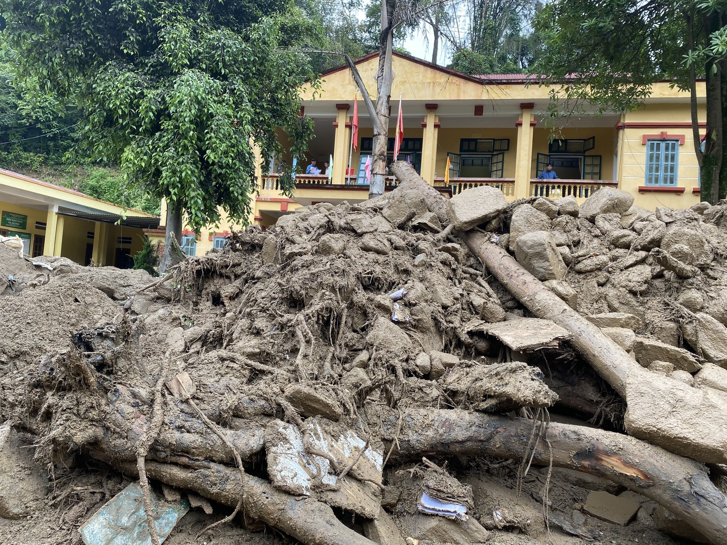 Hình ảnh đất, đá ngổn ngang, vùi lấp toàn bộ tầng 1 trụ sở UBND xã Hồ Bốn cùng hàng chục bộ máy tính, tăng âm loa đài, máy nổ.