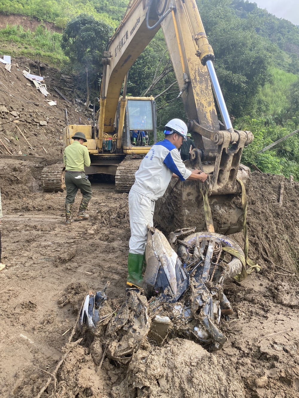 Đội hỗ trợ của thủy điện Văn Chấn cùng máy xúc T200, xe chở đất đá 2 cầu 6 khối vượt hơn 120km từ huyện Văn Chấn đến phối hợp với các đơn vị dọn dẹp đất, đá từ ngày 9/8.
