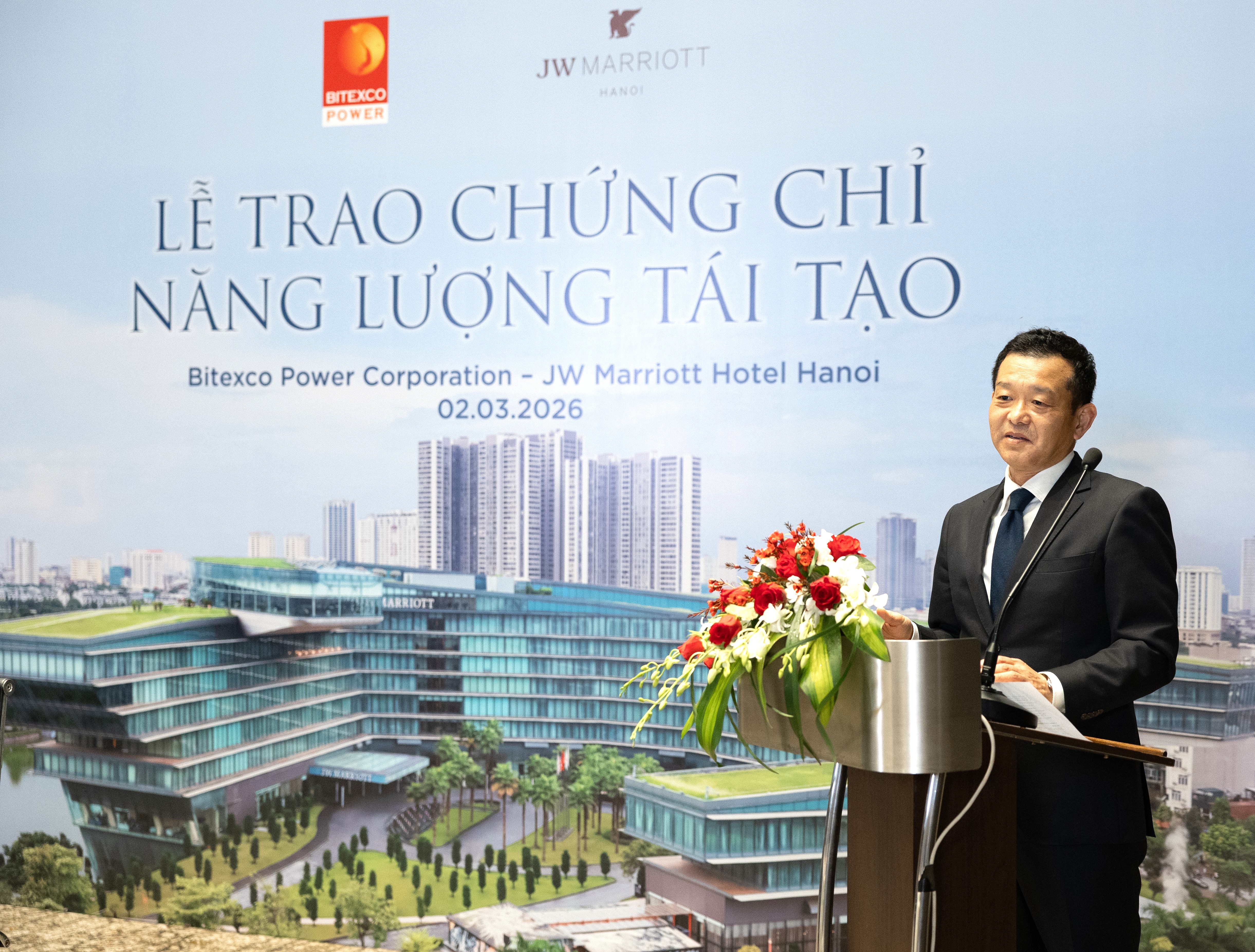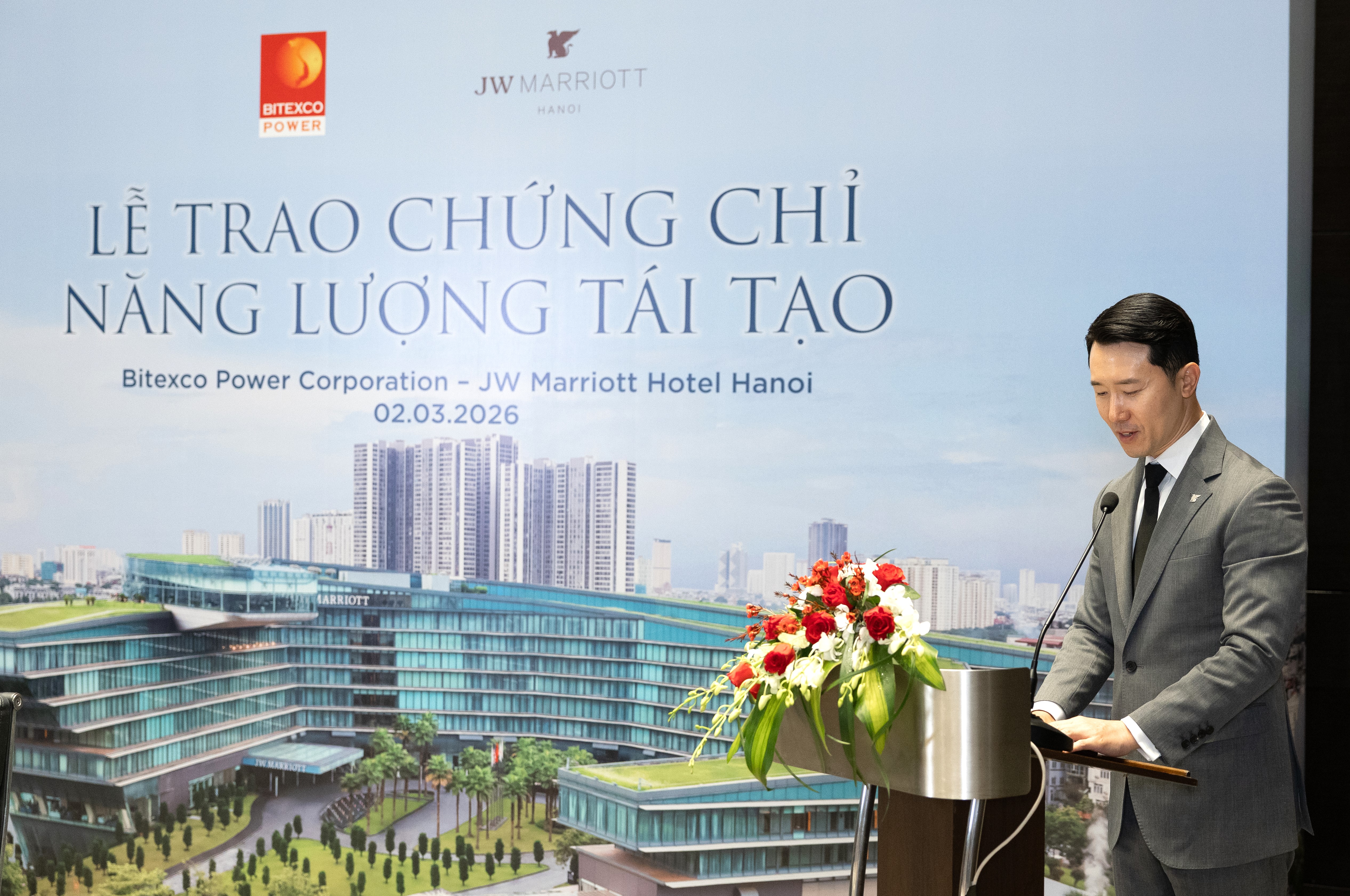 Chiều 2/3/2026, Bitexco Power đã ký kết và trao Chứng chỉ Năng lượng tái tạo (Renewable Energy Certificate – REC) cho JW Marriott Hotel Hanoi – biểu tượng khách sạn nghỉ dưỡng cao cấp tại Việt Nam. Sự kiện này góp phần thúc đẩy xu hướng sử dụng năng lượng tái tạo trong ngành khách sạn tại Việt Nam.